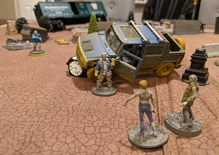 I rolled three Selfish characters, and two dogs (plus a random Outdoorswoman) so I knew noise would be an issue. But I underestimated how much those triggerhappy fools would complicate matters. The weather started at a heavy rain, limiting line of sight. But once Terry, the merciless leader, got towards the center, he kept firing at the incoming horde, which kept drawing roaming zombies into the back line. I tried to keep the hounds to one side, to limit their noise, but they strayed too close to that board edge as well, which kept them busy keeping other roamers at bay. Manny, Terry's goon sidekick, tried to hold off the new arrivals, but eventually got overwhelmed when he was forced to back into a wreck. Within five turns, discretion turned into the better part of valor, and the crew split up and left different table edges carrying three supplies. Manny made a full recovery... or so it seems.
